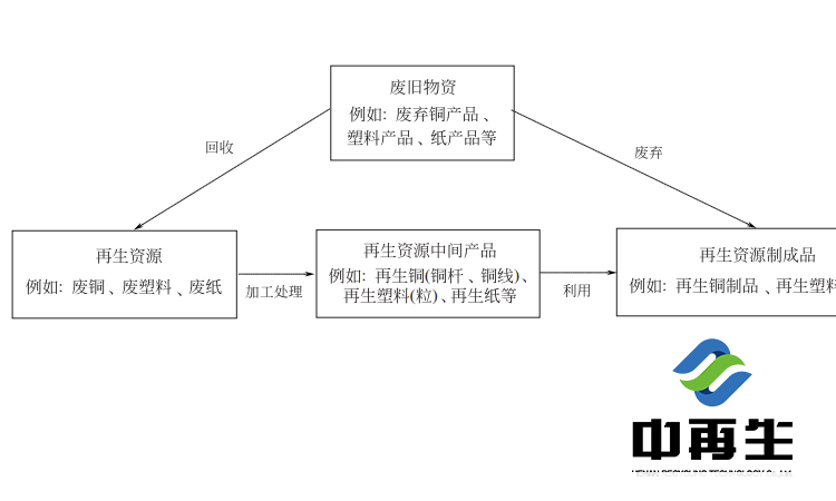 再生資源是指來源于社會生產(chǎn)和生活消費過程的各類廢棄物,經(jīng)過回收、加工和利用等環(huán)節(jié),可以重新獲得使用價值的物質(zhì)。此外,對符合國家環(huán)保控制標(biāo)準(zhǔn)的進(jìn)口可用作原料的固體廢物也是中國再生資源的一個重要來源。需要注意的是,再生資源與再生資源產(chǎn)品的概念有區(qū)別。例如再生銅、再生鋁、再生塑料等概念是指廢舊銅、鋁和塑料經(jīng)過回收、分揀、熔煉、拉絲造粒等環(huán)節(jié)加工而成的中間再生資源產(chǎn)品,為制造企業(yè)深加工得到再生資源的制成品提供原料,如圖所示: