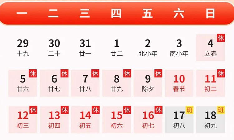 根據(jù)國家法定節(jié)假日安排,我公司將于2024年春節(jié)期間放假,具體時間如下: