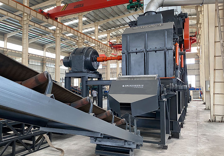 破碎線主機(jī)殼體采用特厚鋼板制造,內(nèi)襯為高錳鑄鋼件,可更換;主機(jī)轉(zhuǎn)子盤(pán)安裝于水平軸上,轉(zhuǎn)子盤(pán)圓周分布有銷(xiāo)軸,軸向懸有錘頭;主軸用滾珠軸承支撐,循環(huán)油強(qiáng)制潤(rùn)滑冷卻,并裝有溫度傳感器;進(jìn)料口裝有液壓輥筒喂料裝置,位置一高一低,同向旋轉(zhuǎn),能將大件松散物料壓扁,送入破碎腔內(nèi)。